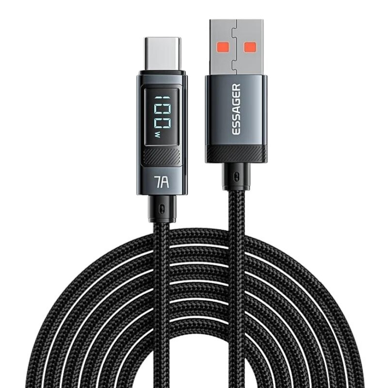 The 100W 7A USB to Type-C Braided Fast Charging and Data Cable with Digital Display - 2 Meters supports fast charging up to 100 watts. You can view the current power value thanks to the mini screen on the product. It supports data transfer speeds up to 480Mbps. It supports most fast charging protocols.