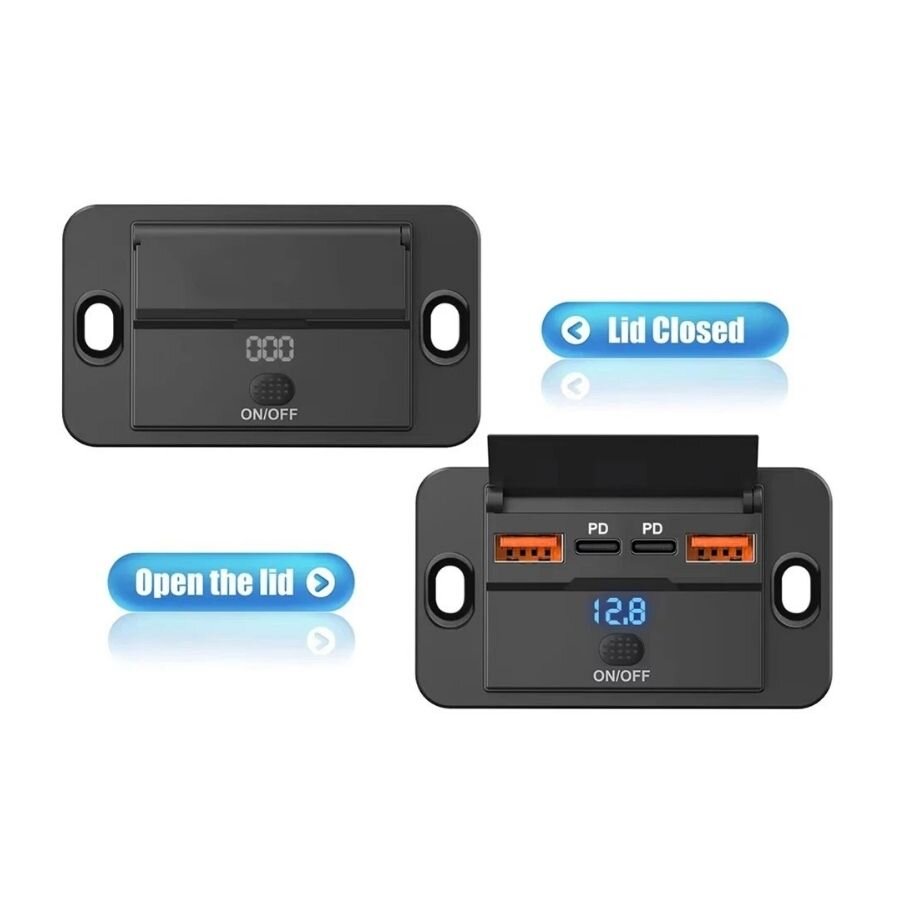 12-24V 2xPD Type-C + 2xQC3.0 Voltaj Göstergeli Şarj Soketi, araba, karavan, yat, tekne vb. araçlarda kullanılabilen sokettir. İki farklı çıkış portu ile birçok cihazı şarj edebilirsiniz. Toplamda dört adede kadar cihazı aynı anda optimum verimlilikle şarj etmenizi sağlayarak uzun yolculuklar veya gezilerde kullanılabilecek ideal bir üründür.