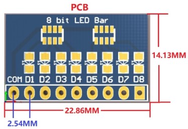 The 3.3V 5V 8-Bit Blue LED Module - Cathode is an 8-bit blue LED display module designed for both 3.3V and 5V power systems. Its common cathode configuration makes it compatible with a wide variety of digital applications. This module is ideal for visual output displays in a variety of electronic devices, including status indicators, bar graphs, and LED arrays.