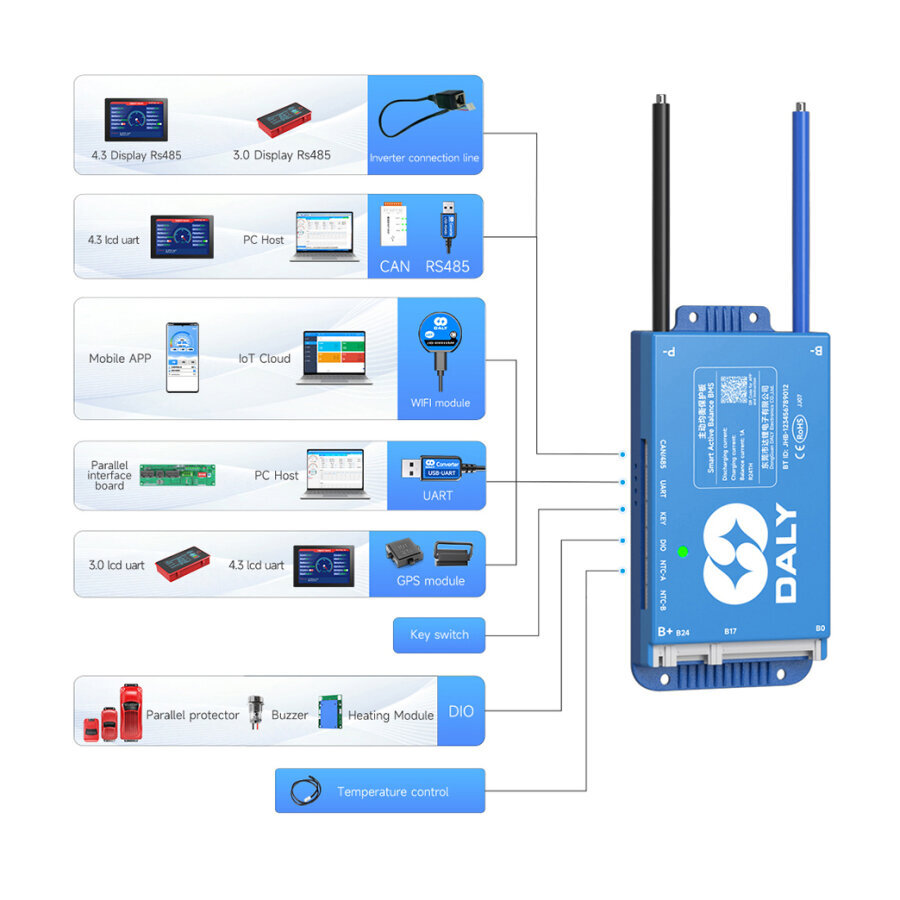 The 4-8S 40A Daly Smart BMS Active Balance Circuit Li-ion/Lifepo4/LTO - BT+RS485+CAN is a battery management solution that offers high security and performance in energy management systems. With its 40 amp capacity and support for 4s-8s cell structures, it can be used in both residential and industrial projects.