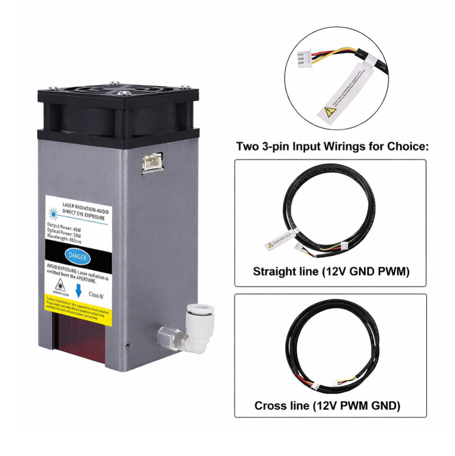 40W 450nm Yakıcı CNC Lazeri - 30L/min Ayarlanabilir Hava Pompalı, ahşap, plastik, kauçuk, akrilik ve diğer malzemeleri işlemek için kullanılabilir yakıcı lazerdir. Dalga boyu 450 Nm'dir. 12V DC voltaj ile çalışmaktadır.