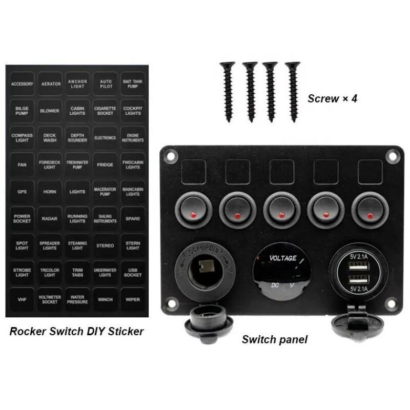 5'li ON-OFF Kırmızı Nokta Işıklı Anahtar Switch Panel 2x5V USB Çakmaklık ve Voltaj Göstergeli, Genellikle otomotiv sektöründe, araçlarda, teknelerde ve karavanlarda tercih edilen bir üründür. Ürünün üzerinde 5 adet ışıklı on-off anahtar bulunmaktadır. Ayrıca panel üzerinde 5V 2.1A çıkış veren iki adet USB bulunmaktadır. Bu USB çıkışların yanında ise bir adet çakmaklık girişi ve akünün voltaj durumunu görebileceğiniz bir voltaj göstergesi bulunmaktadır.