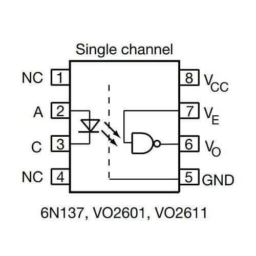 6N137, 8 pinli SOIC paketinde açık delikli tek kanallı yüksek hızlı 10MBd optokuplördür. Bu cihaz temel olarak mikroişlemci sistem arayüzü, PLC, ATE giriş/çıkış izolasyonu, bilgisayar çevre arayüzü, CC-link, DeviceNet, profibus, SDS, yüksek hızlı A/D ve D/A dönüştürme, AC plazma gibi dijital field bus izolasyonunda kullanılır. ekran paneli seviyesi kaydırma, çoğullanmış veri iletimi, dijital kontrol güç kaynağı ve toprak döngüsünün ortadan kaldırılması.