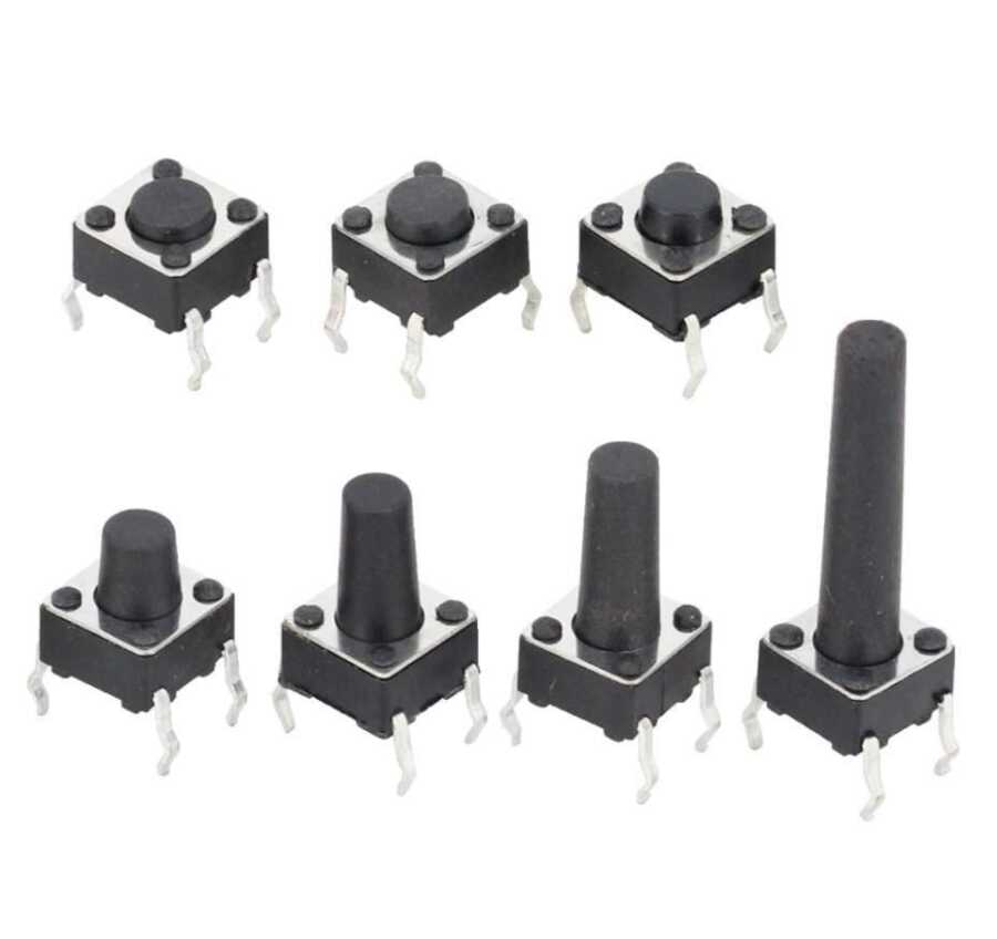 Widely used as standard input "buttons" in electronic projects. These work best when you mount them to a PCB, but can also be used on a breadboard for temporary connections in prototypes. They are normally open (disconnected) and momentarily closed when the button is pressed, completing the circuit.