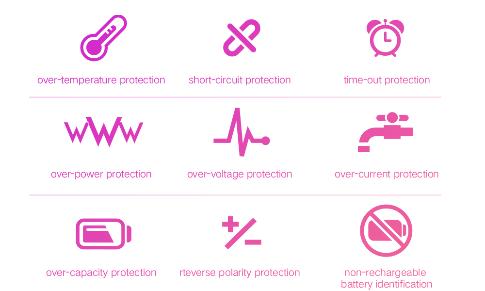Larger current-independent multi-channel fast charging, 1500mA current output per slot, 90-minute quick charge. All-in-one control for Li-ion, LiHV, LiFe, NiMH, NiCd, and NiZn batteries. Automatic battery type identification with intelligent charging algorithm matching.