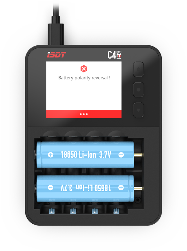 The ISDT C4 EVO supports 1 to 4 cylindrical battery slots (AAA, AA, 18650, 21700, 26650, etc.). It supports a wide range of protocols with USB-C input power, ranging from 5 to 12 V. With QC and PD support, it can even be powered by laptop adapters. The display is an IPS LCD with high contrast and a wide viewing angle, making the charge status easy to read in all conditions.