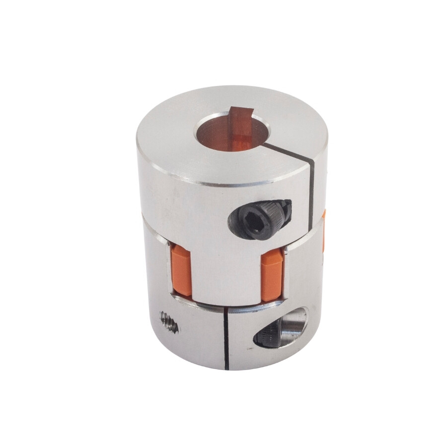 They are also called Elastomer Couplings because they are equipped with plastic or rubber material between the aluminum pair. Elastomeric coupling types have the ability to provide shock absorption. This Flexible Coupling with an outer diameter of 40 mm and a length of 50 mm is a machined aluminum coupling.