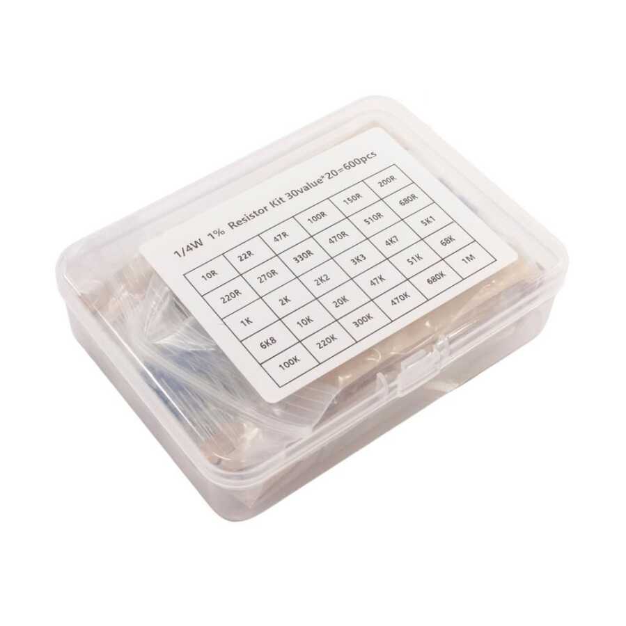 Elektronik uygulamalarınızda ve arduino projelerinizde kullanabileceğiniz, en çok kullanılan direnç çeşitlerinden oluşmuş bir settir. 30 çeşit dirençten 20'şer adet bulunmaktadır, toplam 600 adet 1/4W direnç vardır.