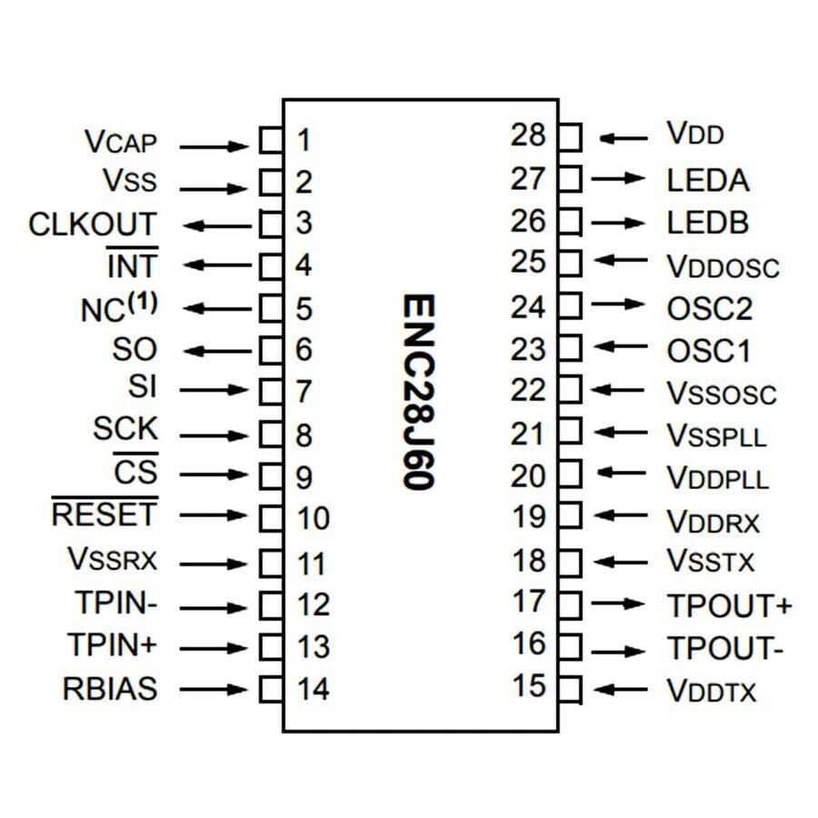 ENC28J60, endüstri standardı Seri Çevresel Arabirime (SPI) sahip bağımsız bir Ethernet denetleyicisidir. SPI ile donatılmış herhangi bir kontrolör için bir Ethernet ağ arayüzü olarak hizmet etmek üzere tasarlanmıştır.
