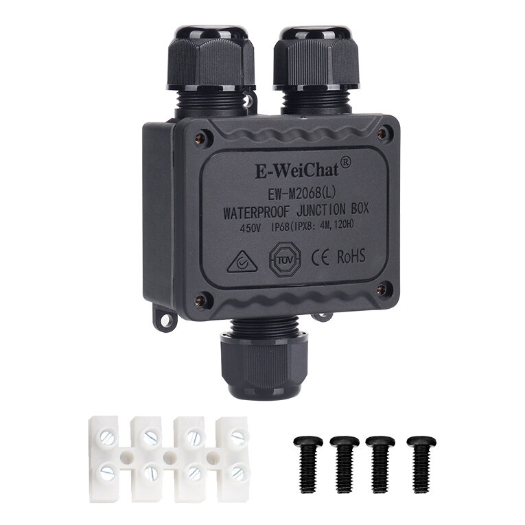 The EW-M2068L-3Y 3-Way Waterproof Cable Junction Box ensures error-free installation. Glands at the box's connection points simplify installation. Integrated cable glands with milled teeth allow for the installation of small-section cables.