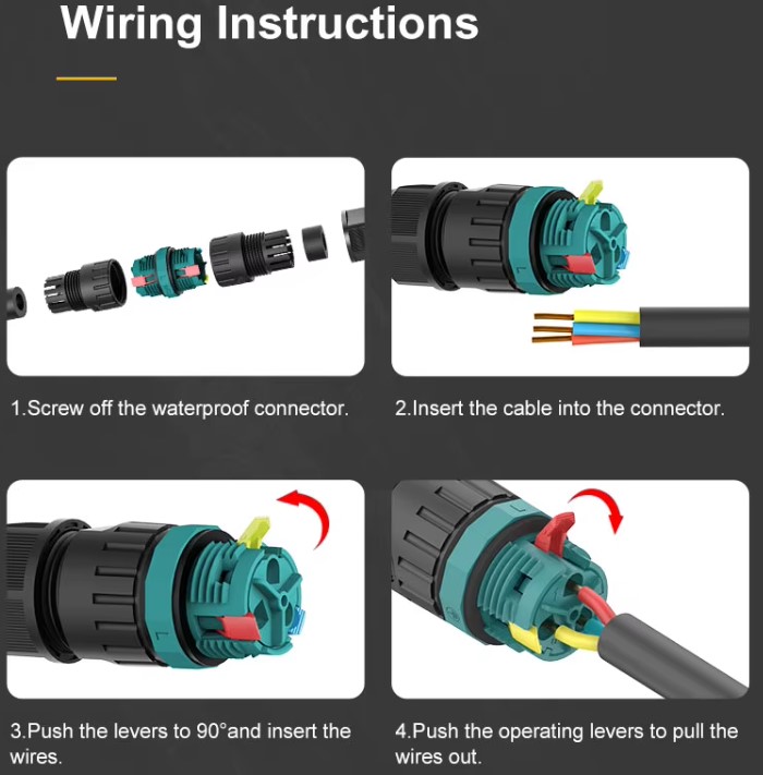 E-Weichat waterproof connectors are designed for easy installation and maintenance with their plug-and-play design. They also feature a self-locking mechanism to ensure secure connections. Additionally, these connectors offer properties such as high temperature resistance, low temperature resistance, and chemical resistance, making them suitable for a variety of harsh environmental conditions.