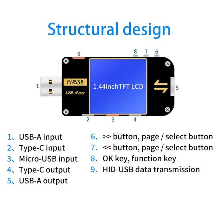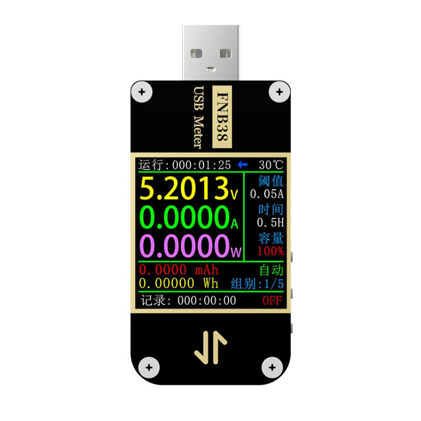 - FNB48P, harici bir 16 bit ADC, PD protokol fiziksel çipi kullanır. USB arayüzleri, cep telefonu şarj cihazları ve U diskleri gibi ürünlerin güç kaynağını veya güç tüketimini ölçebilir. Bu test cihazı, voltaj, akım, güç, direnç, kapasite, sıcaklık, D+/D- voltajı vb. gibi çeşitli parametreleri izleyebilir. Ayrıca şarj cihazlarının hızlı şarj protokolünü de test edebilir.
