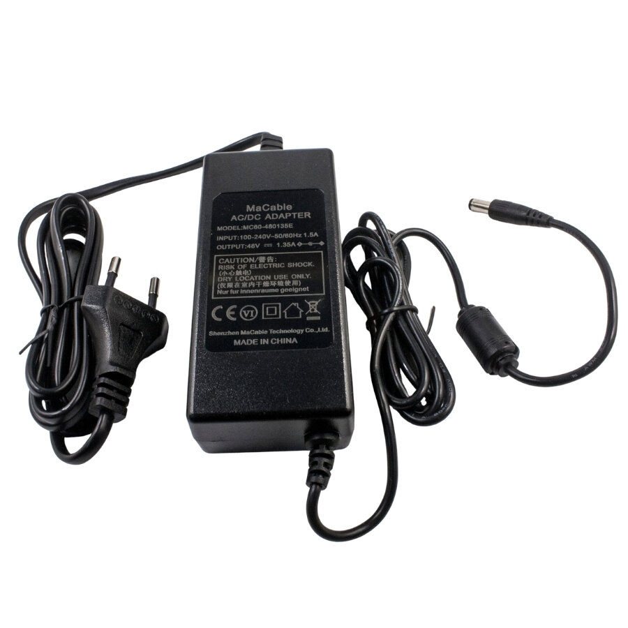 MC60-480135E 48V 1.35A Adapter. Approximately 2.5 meters in length, including cable and adapter. Can be used with 48V electronic products requiring up to 1.35A. The socket is 5.5x2.1mm. The adapter case size is 110x52x33mm.