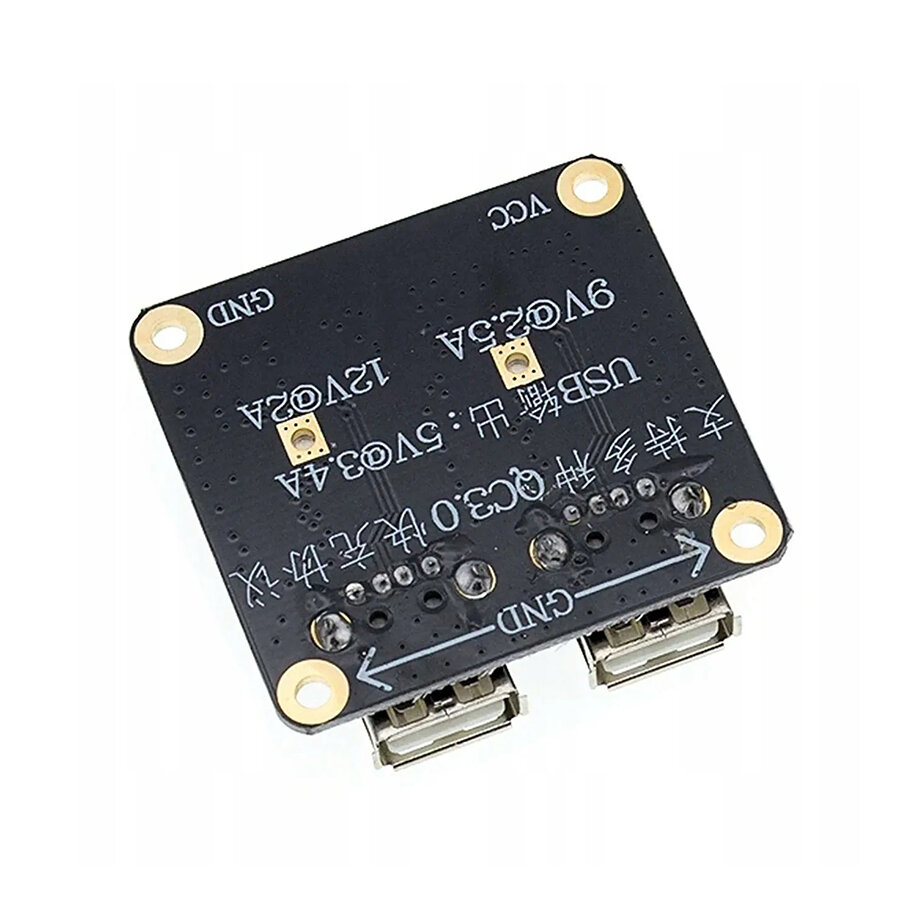 Qualcomm Q3.0 Type C 4.5-32V 2-Channel Fast Charging Circuit. This charging module, featuring two USB ports, supports QC 2.0 and QC 3.0 fast charging technologies, allowing devices to be charged between 5V and 12V. Ideal for use at home, in the office, or on the go.