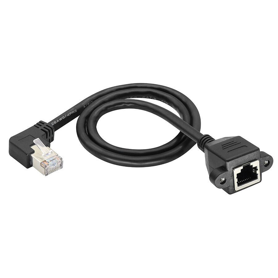 RJ45 Sol Açılı Panel Tipi Ethernet Uzatma Kablosu - 50cm, bir ucu panel tipi dişi rj45 diğer ucu erkek rj45 olan ve erkek olan ucu sol açılı tasarıma sahip yüksek performanslı rj45 uzatma kablosudur. Dar alanlarda kolay montaj sağlayan açılı yapısı sayesinde ağ portlarının erişimini kolaylaştırır; özellikle dar alanlar, duvar arkası montajlar, raf / rack düzenleri ve yoğun kablo demetlerinde ideal çözümdür.