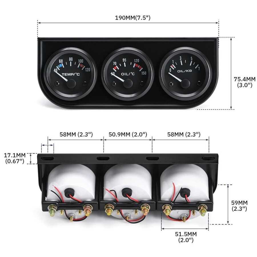 Sıcaklık - Yağ Sıcaklığı - Yağ Miktarı 3'lü Gösterge Paneli. Genellikle otomotiv sektöründe, araçlarda, teknelerde ve karavanlarda tercih edilen bir üründür. Ürünün üzerinde 3 adet ışıklı gösterge bulunmaktadır. Bunlar Su sıcaklığı, yağ sıcaklığı ve yağ basıncı göstergeleridir. Panel kasası metaldir.