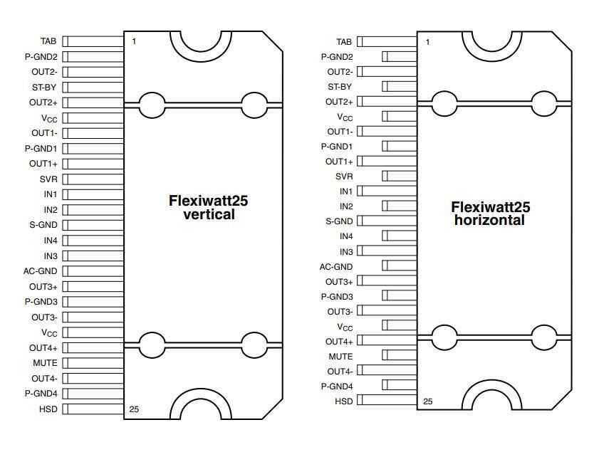 TDA7560 is BCD (Bipolar/CMOS/DMOS) technology class AB audio power amplifier in Flexiwatt 25 package designed for high power car radio. The fully complementary P-Channel/N-Channel output structure, combined with high output current and minimized saturation losses, allows for a rail-to-rail output voltage swing that sets new power benchmarks in the automotive audio field with unparalleled distortion performances.