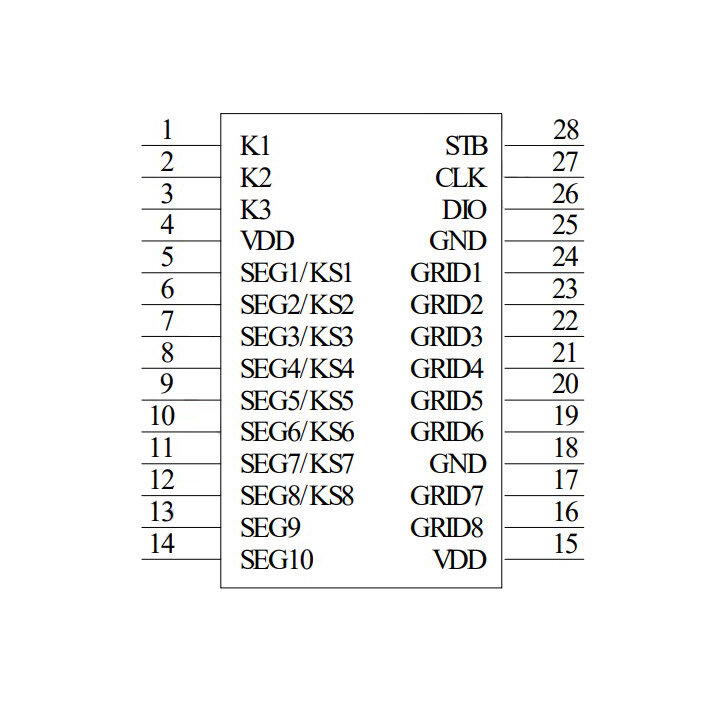 The TM1638 SOP-28 SMD 7-Segment Display Integrated Circuit is an LED driver controller that combines a key scanning interface, MCU digital interface, data latch, LED high-pressure driver, and key scanning features on a single chip.