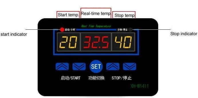 The left display shows the starting temperature. The right display shows the stopping temperature. The middle display shows the current measured temperature. Temperature settings are made with the buttons located under the left and right displays.
