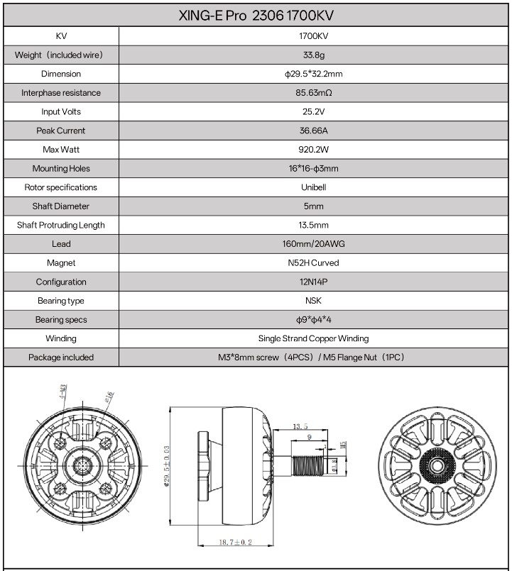 Gelince Haber VerXING-E Pro 2306 1700KV 4-6S FPV Drone Motoru, FPV yarışları için son derece güçlü ve kuvvetli FPV motorlarıdır. Bilinen XING performansıyla mükemmel bir seçimdir. Kaliteye odaklanan XING-E Pro serisi, güçlü ve dayanıklı, uygun fiyatlı motorlardır. Bu 2306 boyutlu motor, yüksek mukavemetli 5 mm çelik içi boş şaft, performans için tek telli sargılar, M3 şaft vidası ve daha büyük 9x4x4 mm NSK rulmanlara sahiptir.