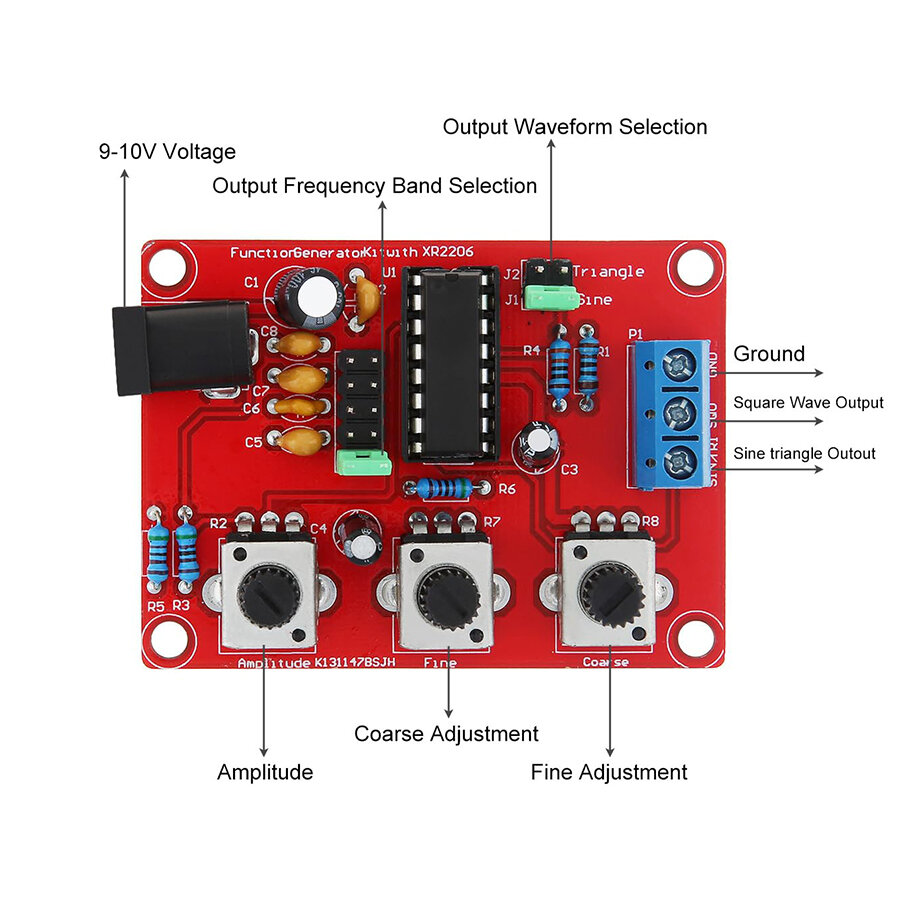 The XR2206 1Hz-1MHz Signal Generator Module generates sine, triangle, and square wave signals. It can generate adjustable signals in the 1Hz-1MHz frequency range. The signal amplitude is adjustable.